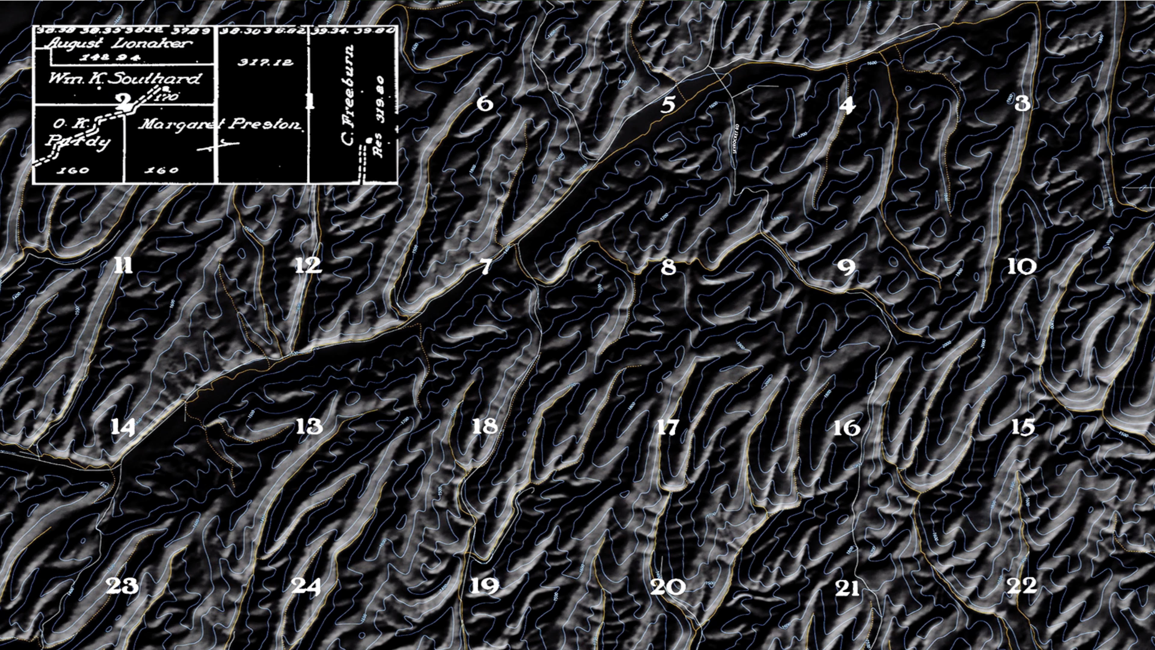 Contour, Gerco de Ruijter, Michel Banabila, 2022, 3 min. Een topografische afbeelding van heuvels en rivierbeddingen, waarop het Thomas Jefferson raster van landpercelen, townships, nummers en namen.En hoewel het land glooiend is, kan dit 2d-raster nog steeds vanuit de lucht worden herkend. Gerco de Ruijter is beeldend kunstenaar, Michel Banabila componist.