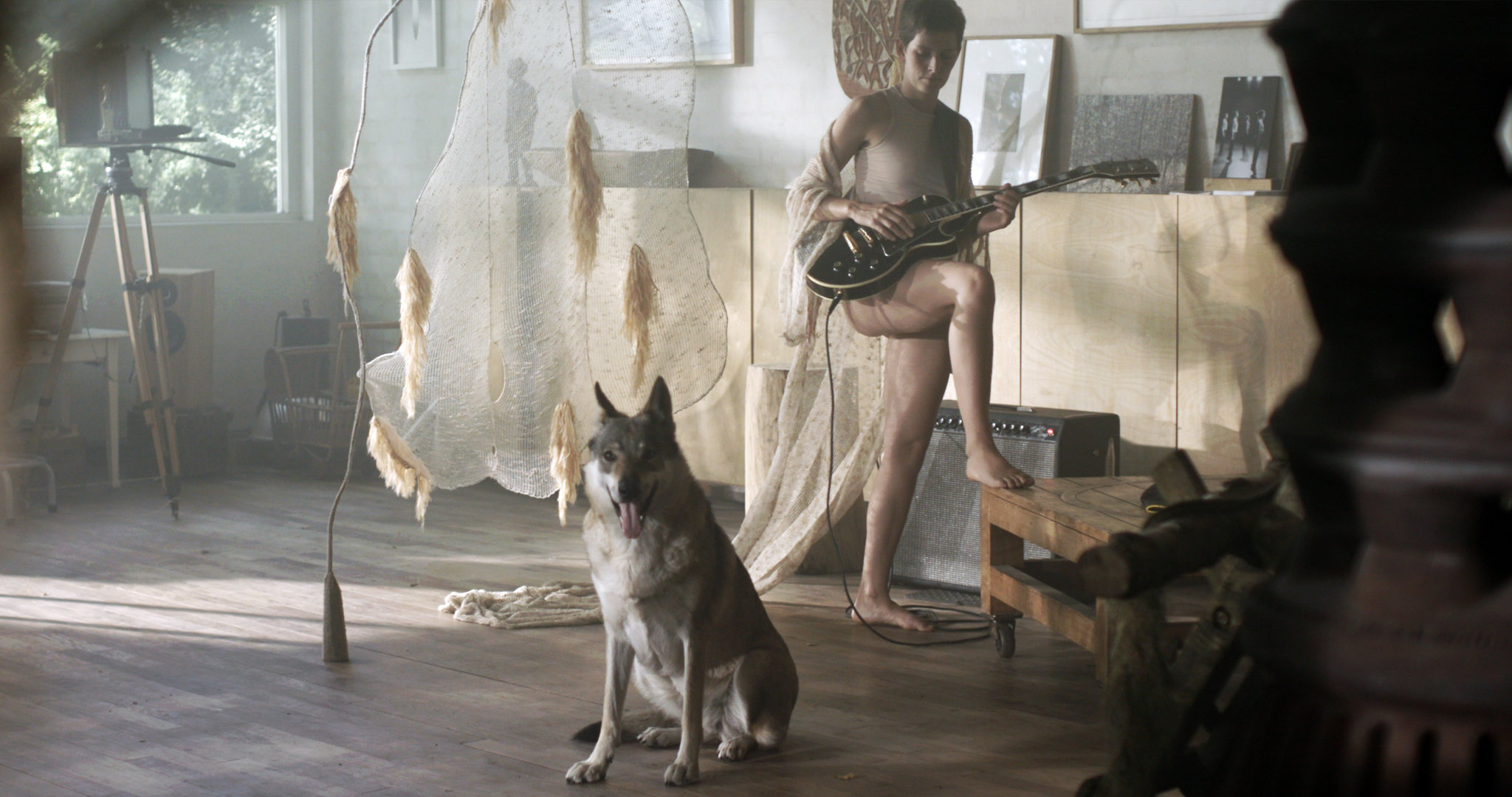 ‘Wat ziet het dier wanneer het naar me kijkt?’ Drie dieren en een vrouw bevinden zich in een afgesloten ruimte. Als ze elkaar onderzoeken, ontstaat een gesprek zonder woorden. We zien ze via close-ups en vanuit verschillende perspectieven, met de vrouw als eenzame soort in dit universum. ‘The Animal That Therefore I Am’ is ook de titel van een boek van filosoof Jacques Derrida waarbij hij de singulariteit van het dier benoemt. In het contact met ‘the animal’ voel je afstand en tegelijkertijd nabijheid. Dit geeft het dier een ondefinieerbare superioriteit.