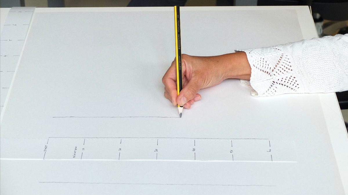 6 Almeerse werknemers werden na een sollicitatieprocedure aangenomen om gedurende één werkdag achtmaal in stilte in één uur één korte rechte lijn te tekenen. Jeanne van der Horst maakte er een film van. Den Houter bevraagt in zijn werk kunst, waarde en tijd. Naast kunstenaar is hij initiator van ‘Het Overschilderschilderij’ en directeur van de BCademy. Van der Horst maakt kunstenaarsportretten en films bij tentoonstellingen.